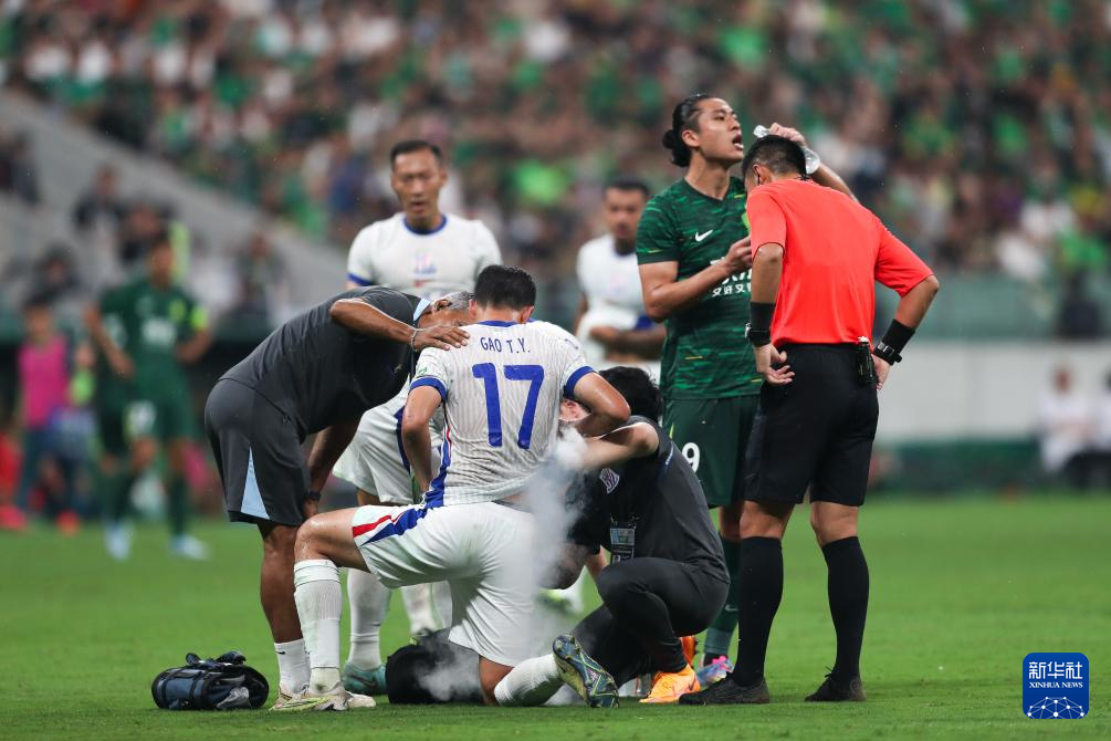 7月19日,上海申花队球员高天意(前中)在比赛中接受队医治疗。