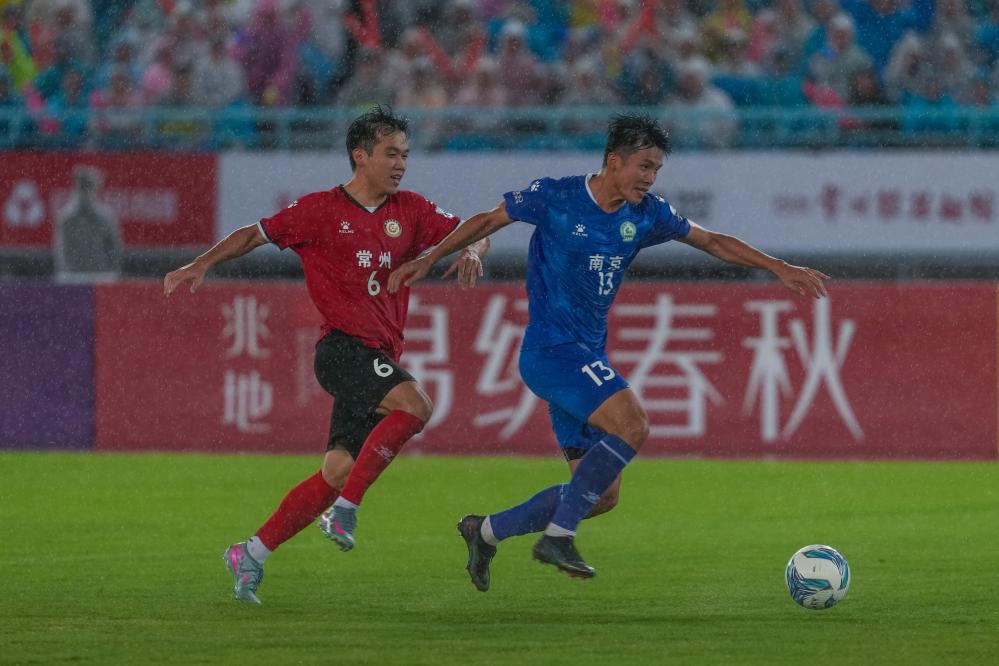 6月14日,南京队球员唐淼(左三)在比赛中突破。在江苏省淮安市举行的2025江苏省城市足球联赛第四轮比赛中,淮安队主场1比1战平南京队。