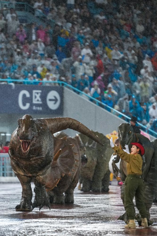 这是6月21日拍摄的比赛中场休息时的恐龙主题表演。