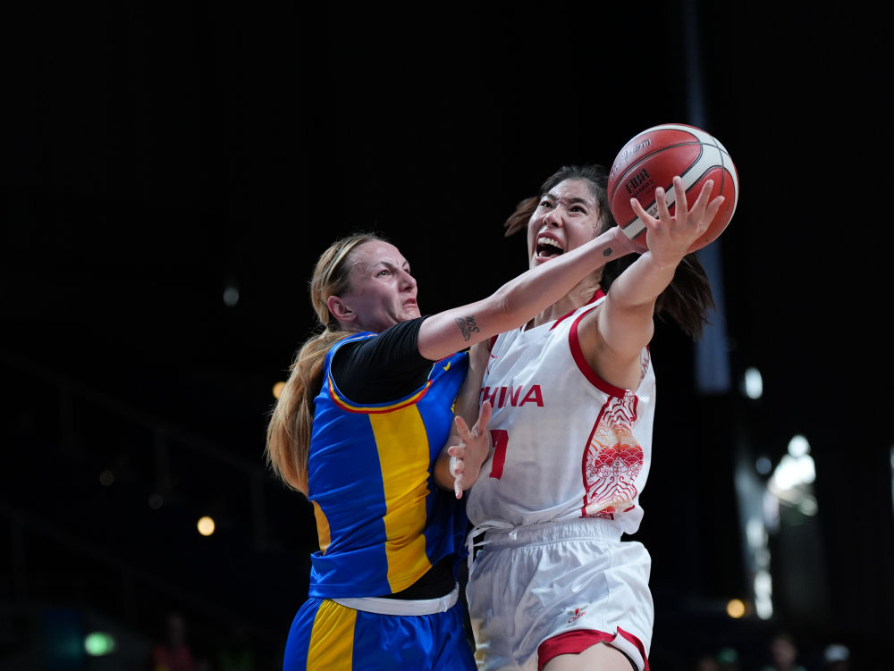7月19日,中国队球员张梓涵(右)在罗马尼亚队球员比安卡·玛丽亚的防守下上篮。新华社记者 王曦 摄