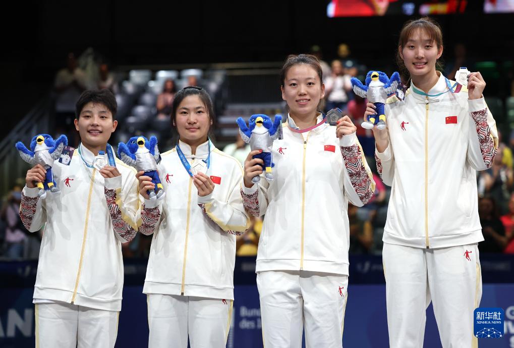 7月20日,中国队球员王小青、刘贝、张涛和高梓悦(从左至右)在颁奖仪式上。新华社记者 张晨 摄