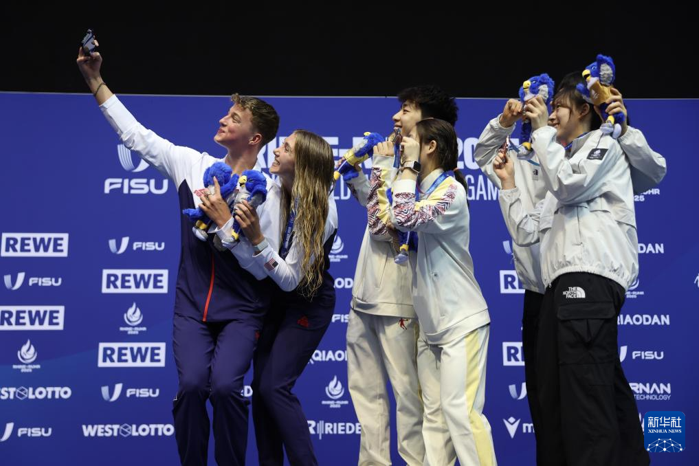 当日,在德国柏林举行的2025年莱茵-鲁尔世界大学生夏季运动会混合双人十米台决赛中,中国组合郑钧之/王伟莹获得冠军。