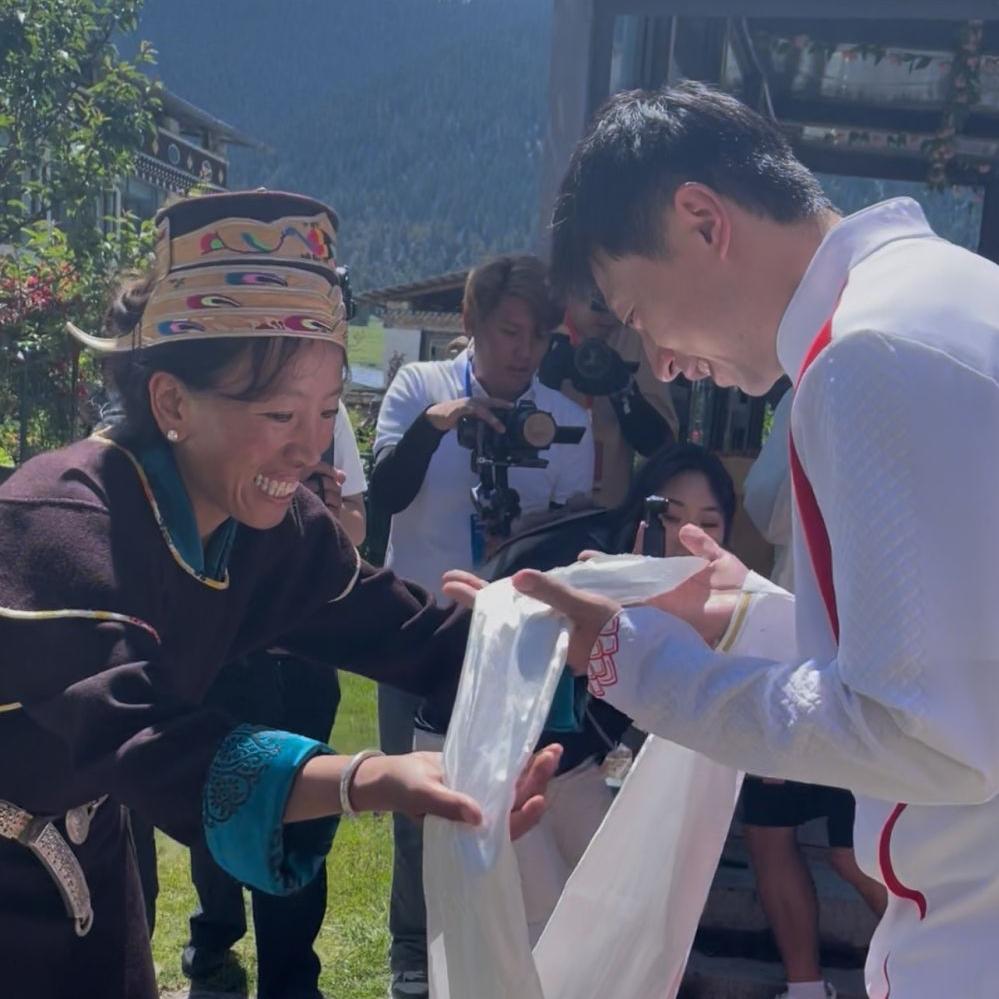 林芝市鲁朗镇岗托村村民为马龙献哈达。新华社记者 蒋梦辰 摄