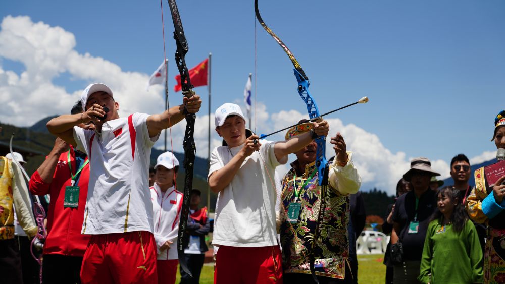 马龙和龙道一在体验藏族传统体育项目工布响箭。新华社记者 蒋梦辰 摄
