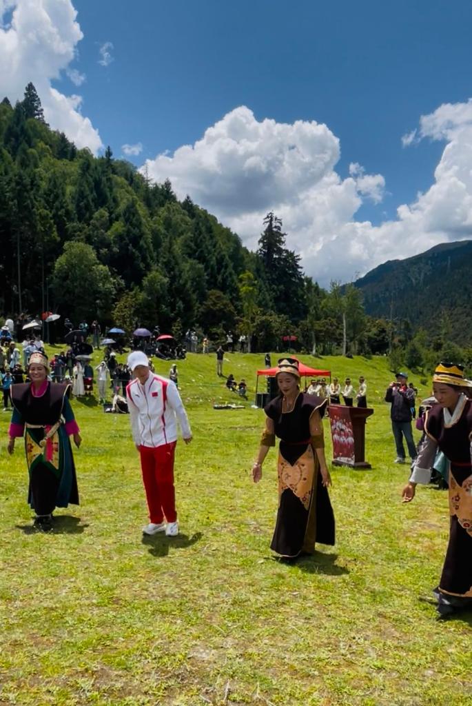 马龙和林芝市鲁朗镇的村民在草地上一起跳锅庄。新华社记者 蒋梦辰 摄