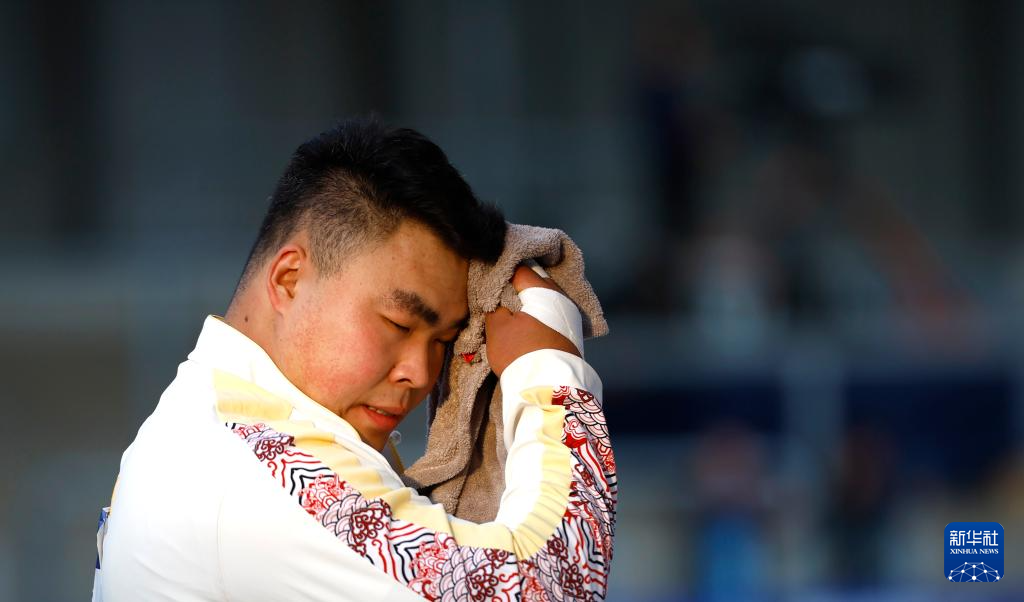7月24日,邢家梁在比赛中擦拭汗水。新华社记者李颖摄