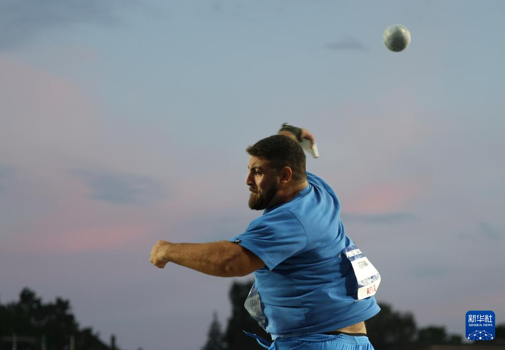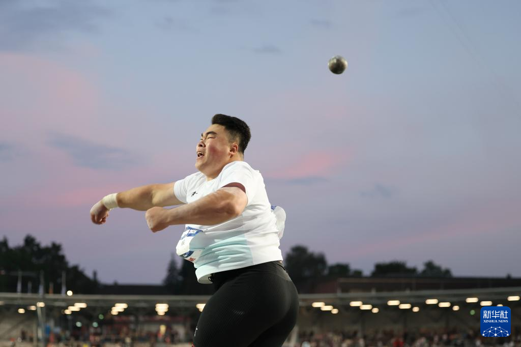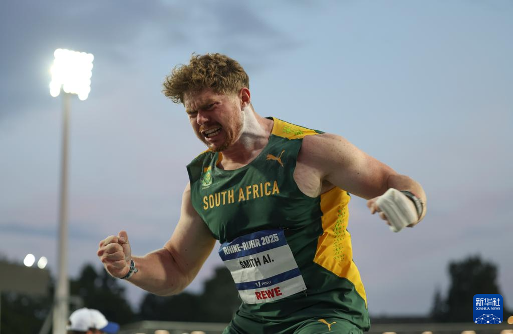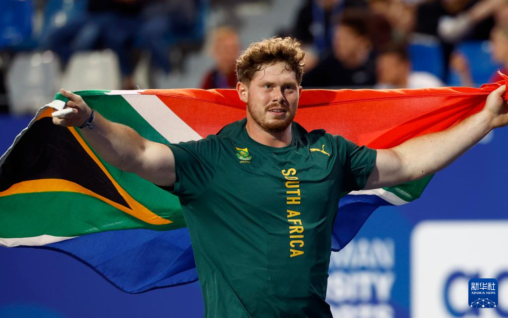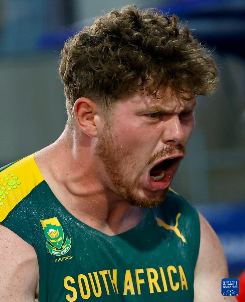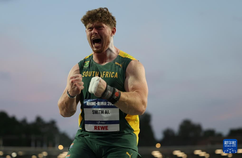 7月24日,南非选手史密斯在比赛中试投后庆祝。最终,他获得冠军。新华社记者 胡星宇 摄
