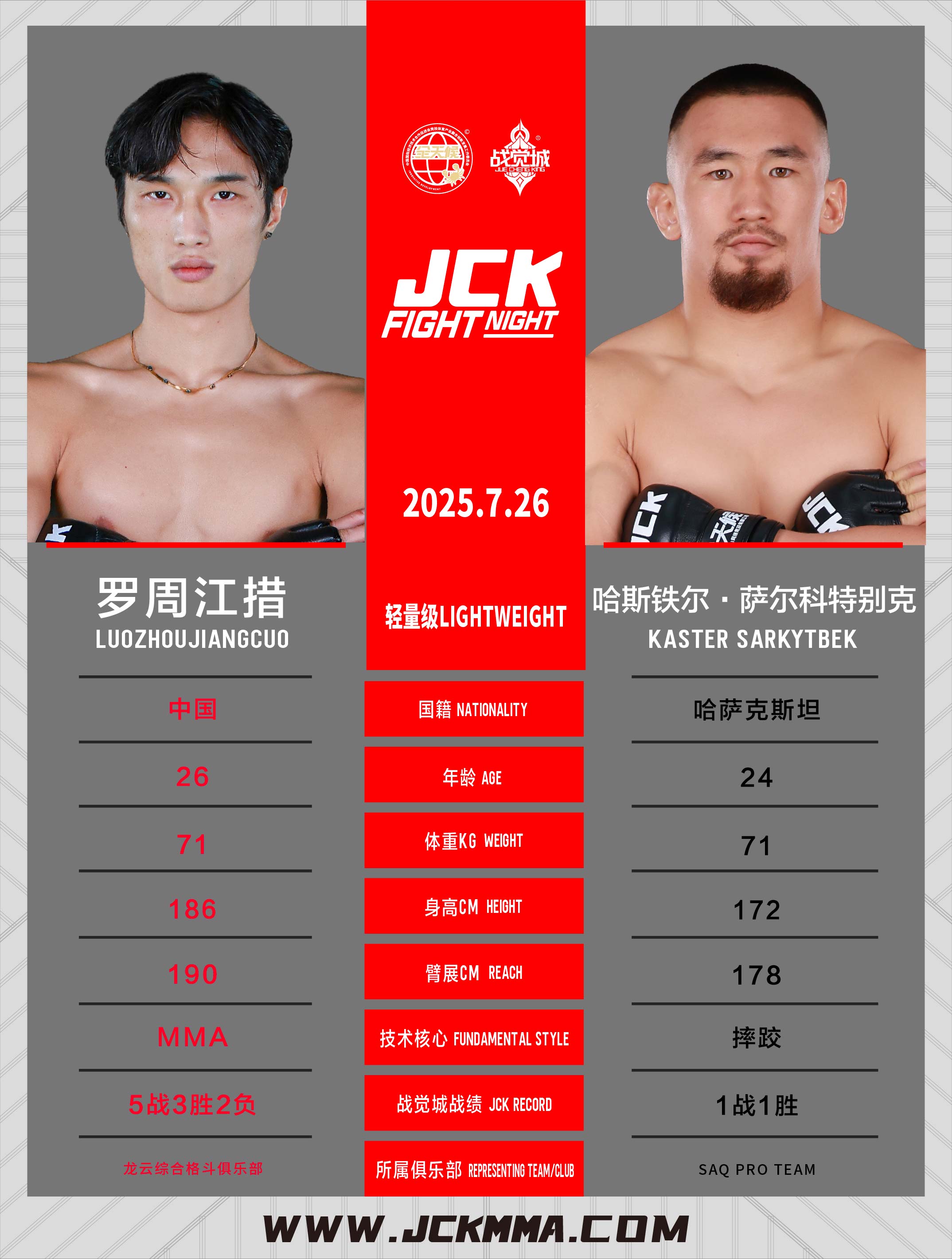 2025年7月26日,JCK觉城之夜N102将于JCK战觉城国际格斗中心开战,头条主赛色吉拉胡VS乌马罗夫·尤苏普,联合主赛加拉思·巴哈提汗VS王奇,正赛部分杨朝旭VS鲁斯塔姆别克·努尔扎诺夫、罗周江措VS哈斯铁尔·萨尔科特别克、特丹让俄VS胡兰·巴特尔艾力。