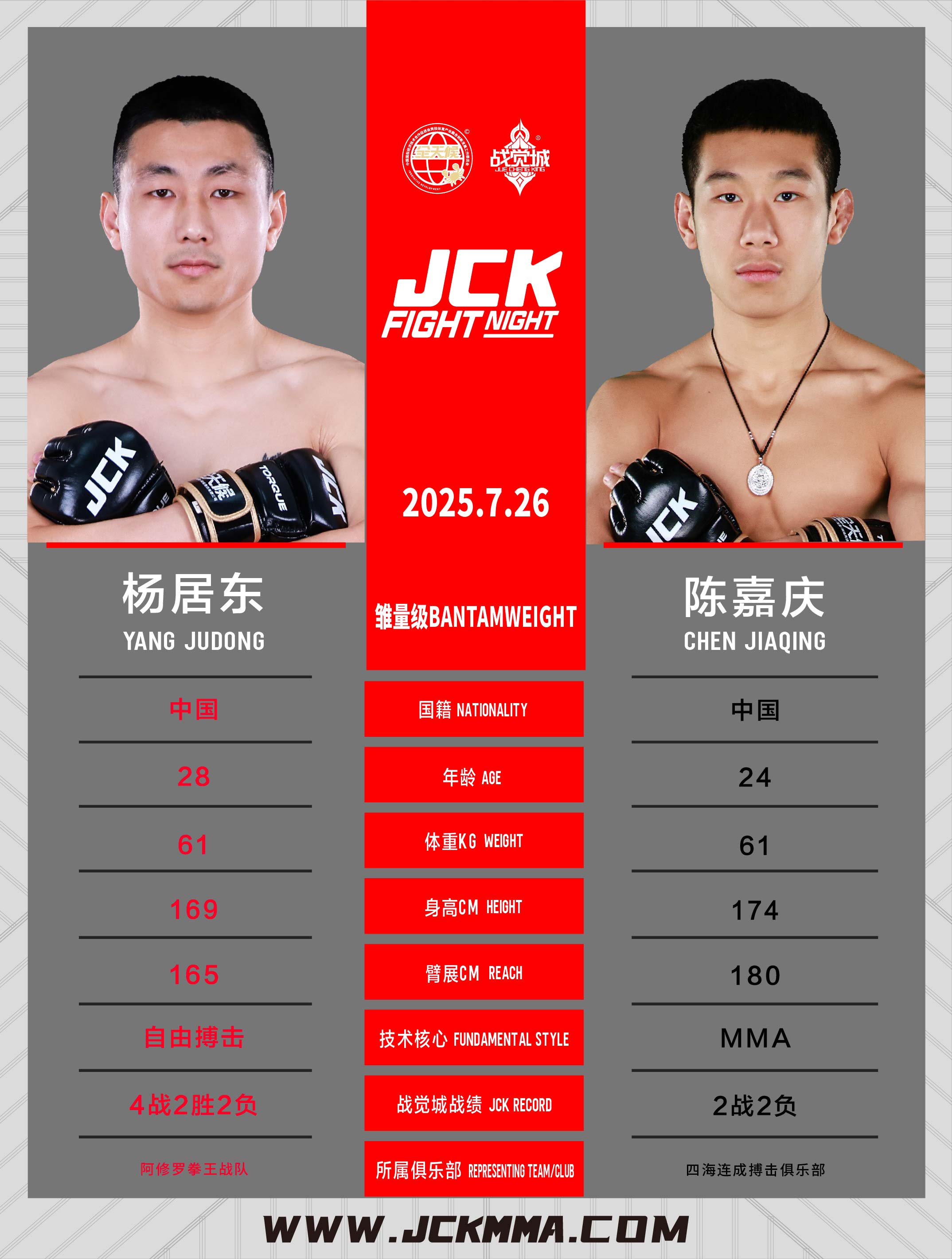 陈嘉庆,曾获得2024年全国综合格斗锦标赛冠军,在JCK战觉城2战2负,相比本次对手,他在身高臂展方面具有优势。