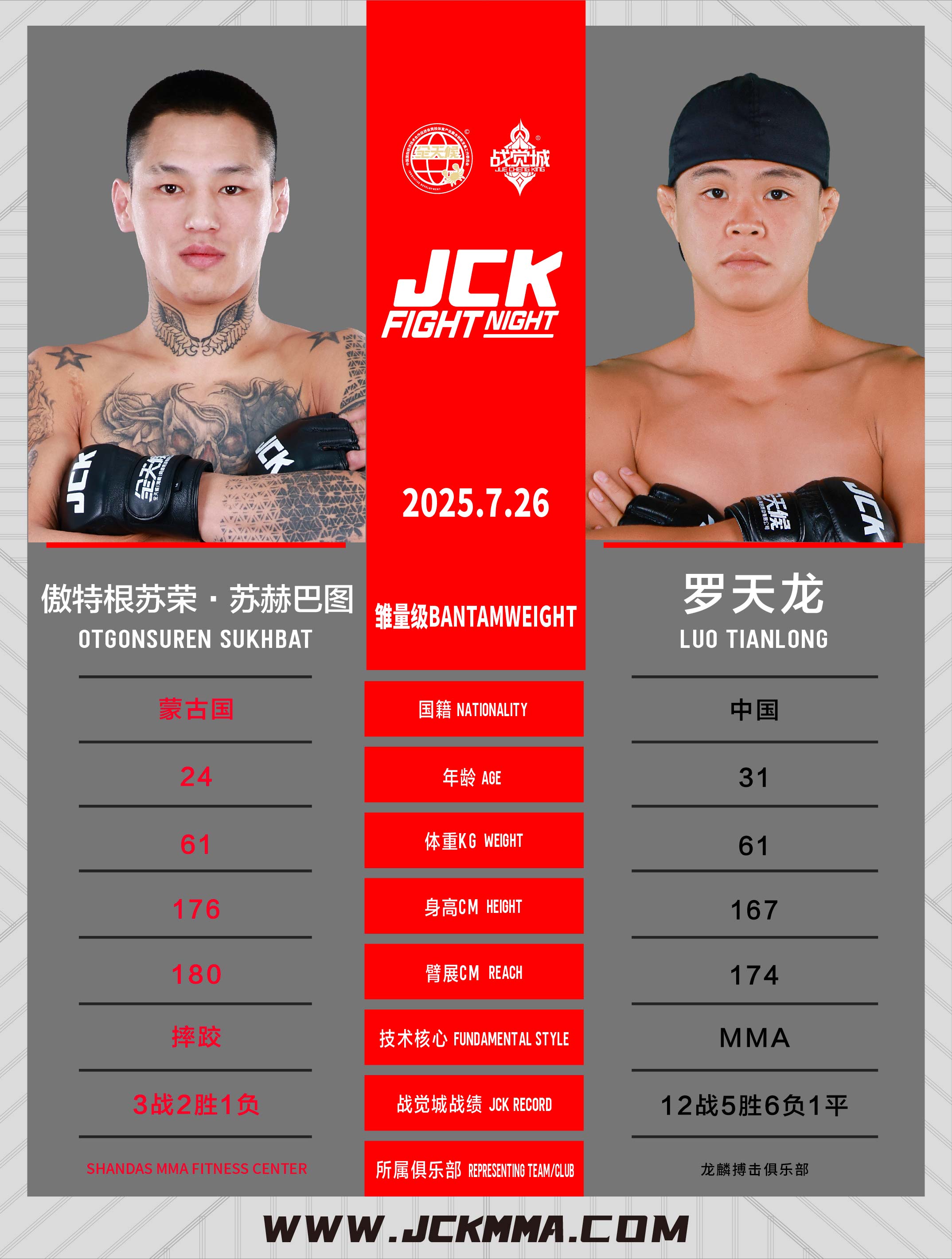 傲特根苏荣·苏赫巴图,蒙古国选手,以摔跤为技术核心,目前在JCK战觉城3战2胜,且两场胜场均为首回合终结,分别TKO努尔加那提·朱马依、背后裸绞降服叶尔波勒·塔加力克。