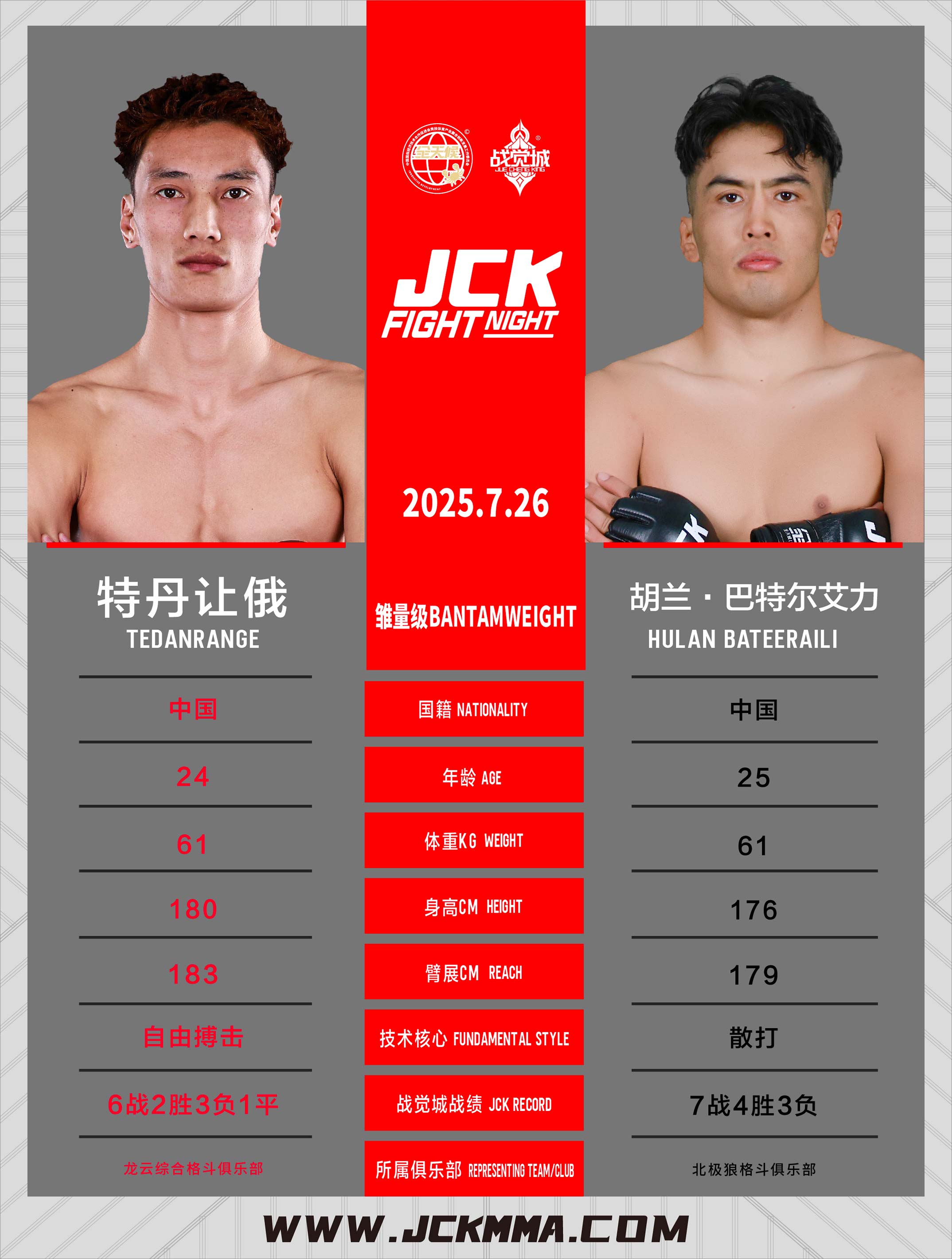 胡兰·巴特尔艾力,技术核心散打,这位签约选手目前在JCK战觉城7战4胜,曾TKO陈孚、阿育木呷,一致判定战胜任治豪,达斯断头降服白涛。