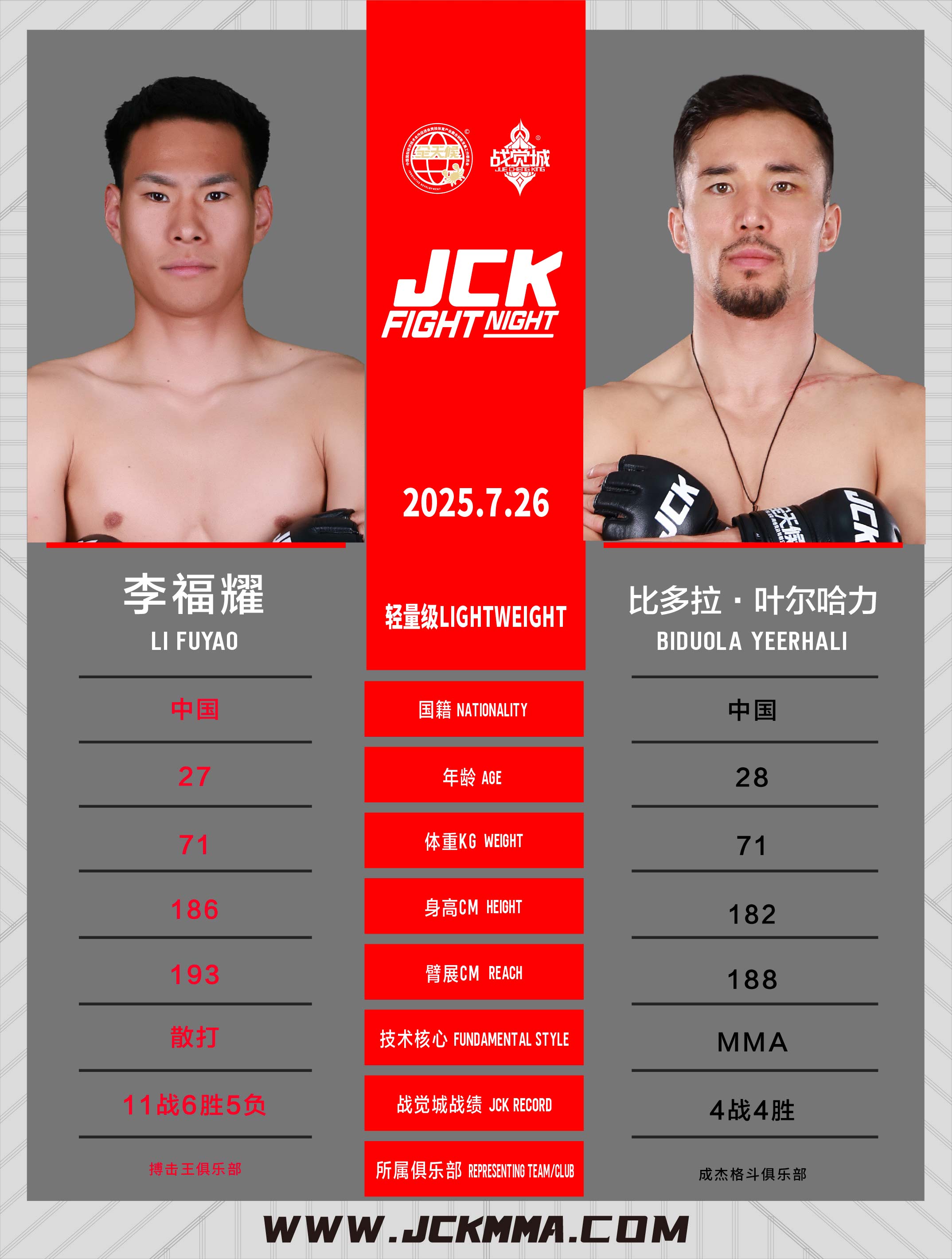 比多拉·叶尔哈力,在JCK战觉城4战4胜,曾背后裸绞降服乌日根巴雅尔、赵炅义,TKO常俊铖、叶尔达吾列提·阿亚提,他在JCK战觉城的4场胜场均首回合终结。