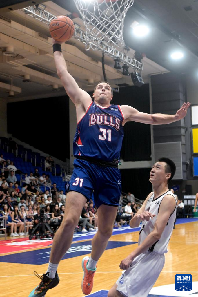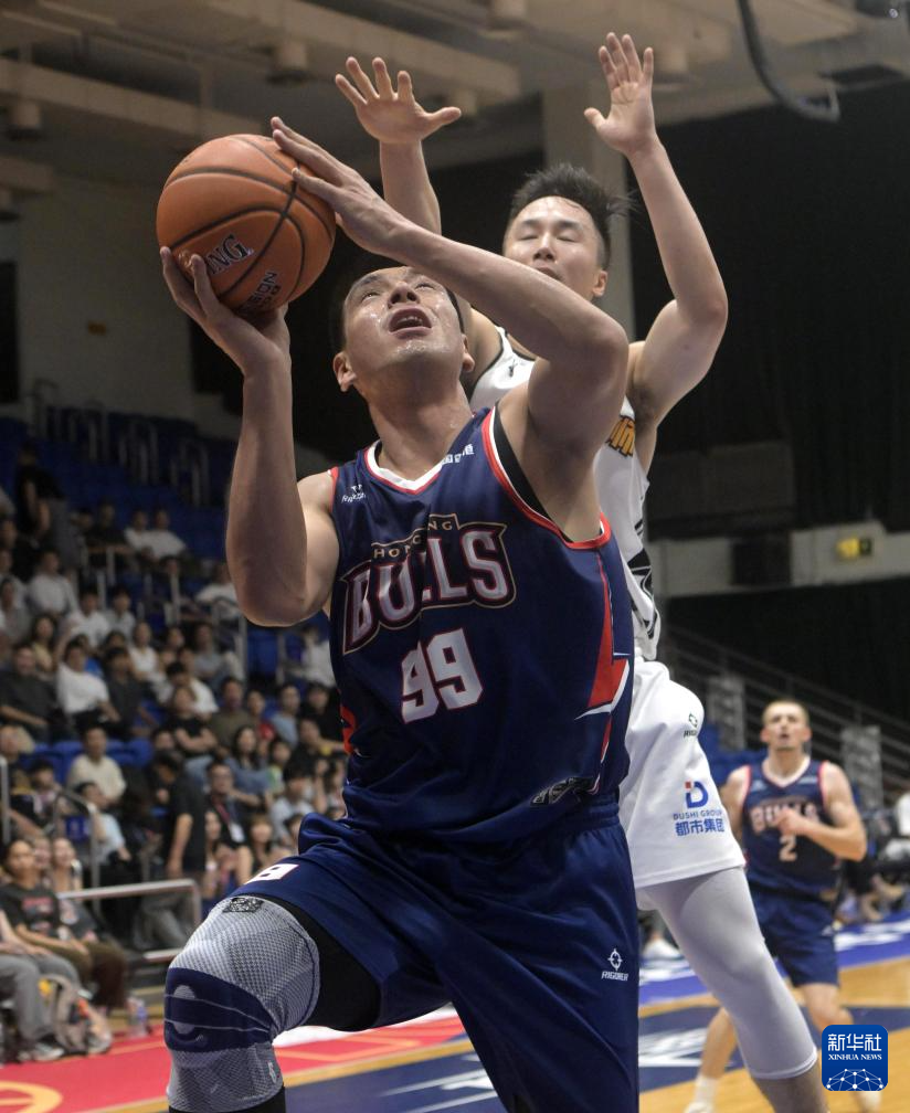 7月25日,香港金牛队球员迈克尔·厄特尔二世(右一)在比赛中上篮。
