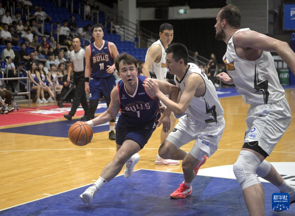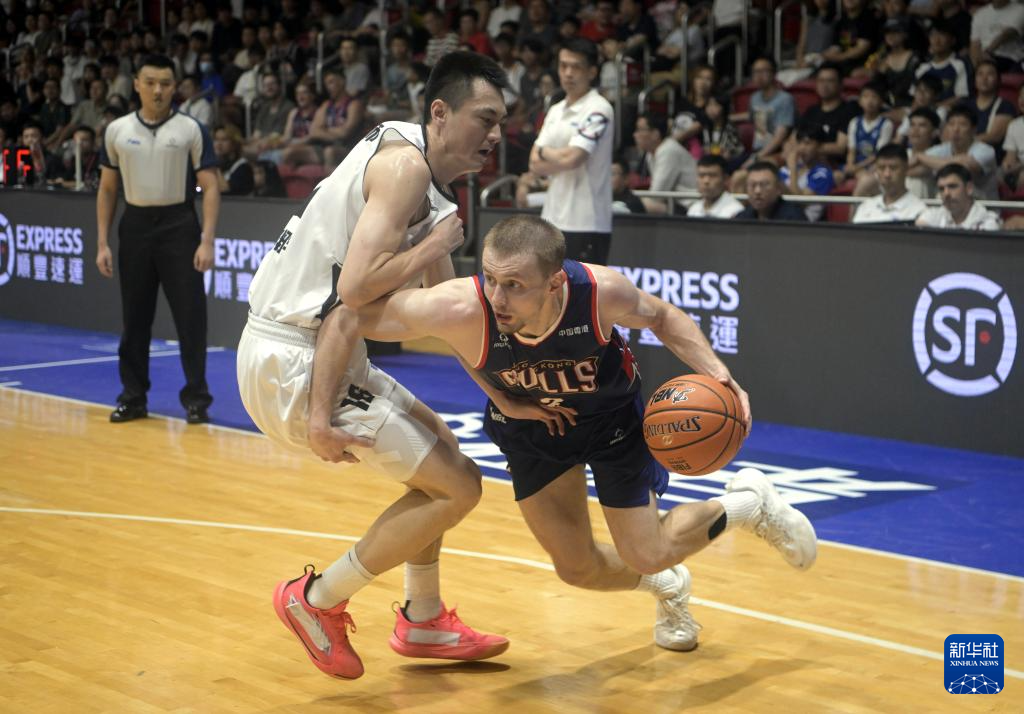 7月25日,香港金牛队球员大卫·詹姆斯(左)防守盐南苏科雄狮队球员张韩。