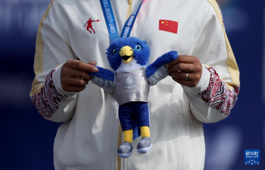 7月26日,中国选手刘妍秀在颁奖仪式上手持大运会吉祥物。