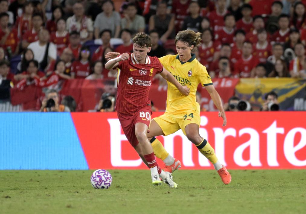 7月26日,AC米兰队球员萨勒马科尔斯(左)在比赛中与利物浦队球员科尔克兹拼抢。