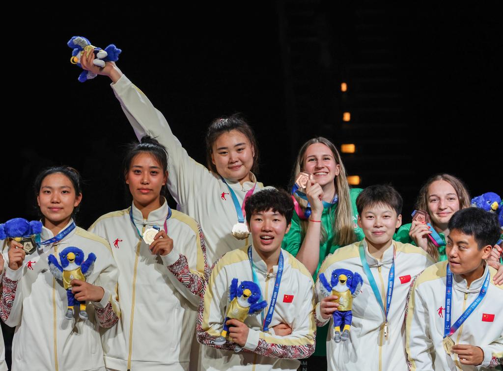 7月25日,冠军中国队球员和季军匈牙利队球员在颁奖仪式上。当日,在德国埃森进行的大运会女篮决赛中,中国队81:69战胜美国队,成功卫冕。新华社记者 张帆 摄