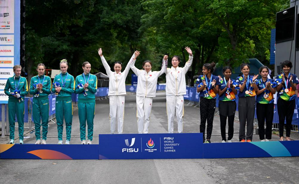 7月27日,冠军中国队(中)、亚军澳大利亚队(左)和季军印度队在颁奖仪式上。当日,在德国波鸿举行的大运会女子20公里竞走决赛中,由宁金霖、季海英和罗悦组成的中国队夺得团体冠军。新华社发(乌尔里希·胡夫纳格尔 摄)