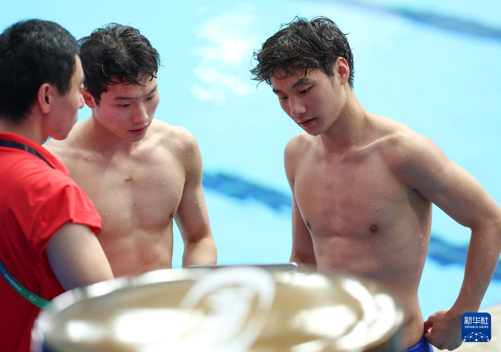 7月28日,中国队组合王宗源(中)/郑九源(右)在试跳后查看比赛视频。新华社记者 雒圆 摄
