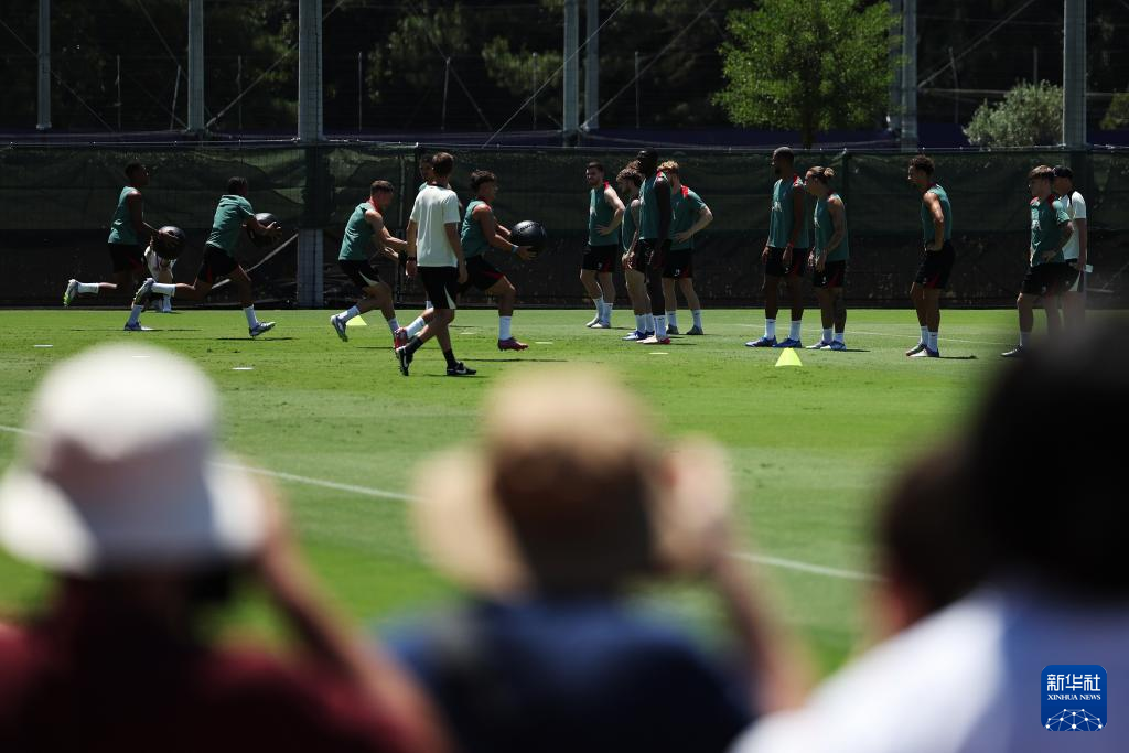 7月29日,利物浦队主教练斯洛特(左一)在训练中指导球员。新华社记者 贾浩成 摄