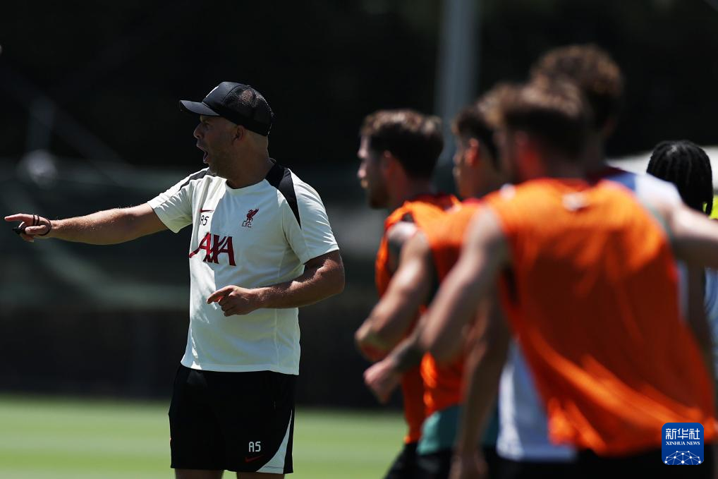 7月29日,利物浦队主教练斯洛特(中)在训练中指导球员。新华社记者 贾浩成 摄