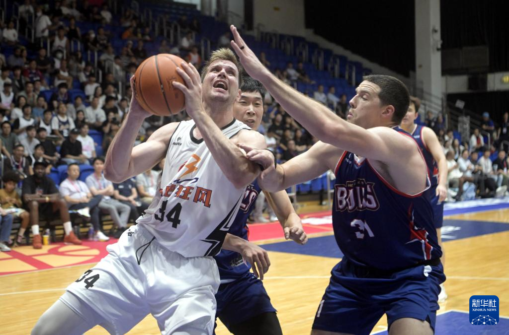 7月29日,香港金牛队球员大卫·詹姆斯(右)防守合肥狂风峻茂队球员阿格拉瓦尼斯。新华社发(卢炳辉摄)