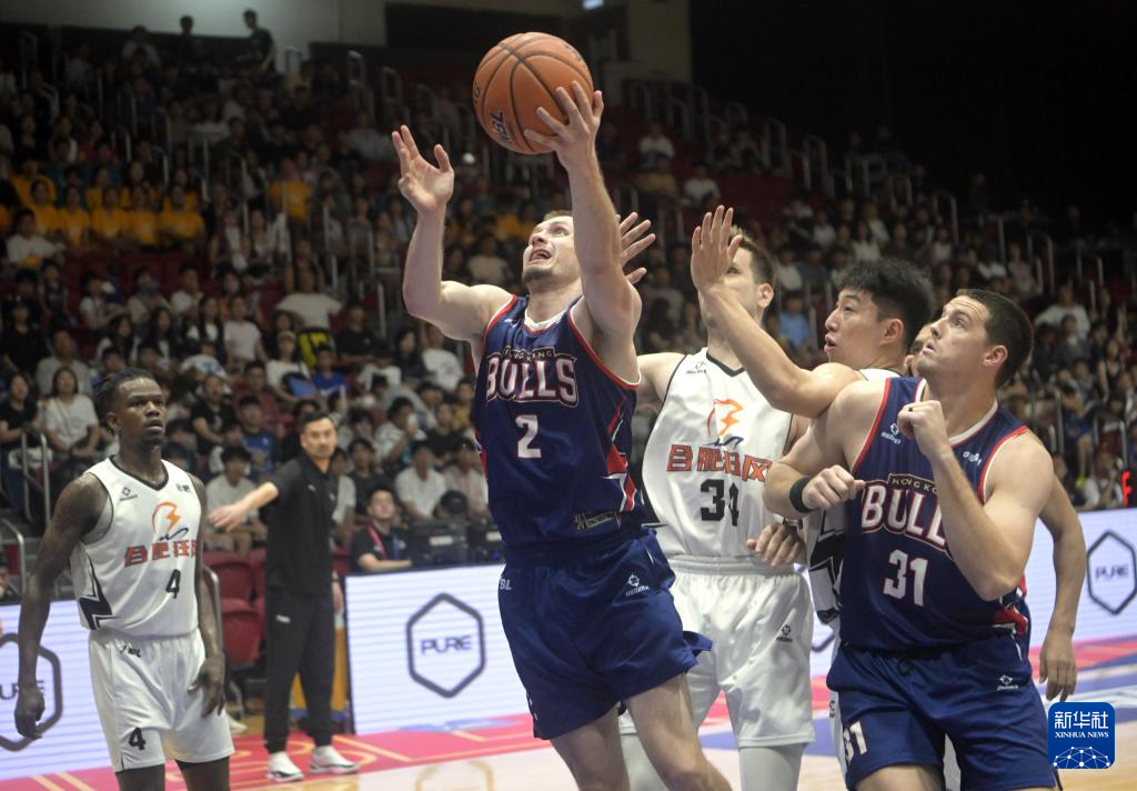 7月29日,香港金牛队球员厄特尔二世(上)在比赛中上篮。新华社发(卢炳辉摄)