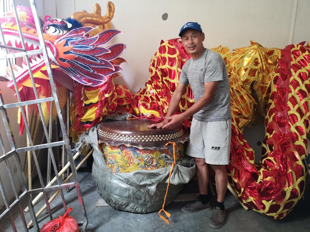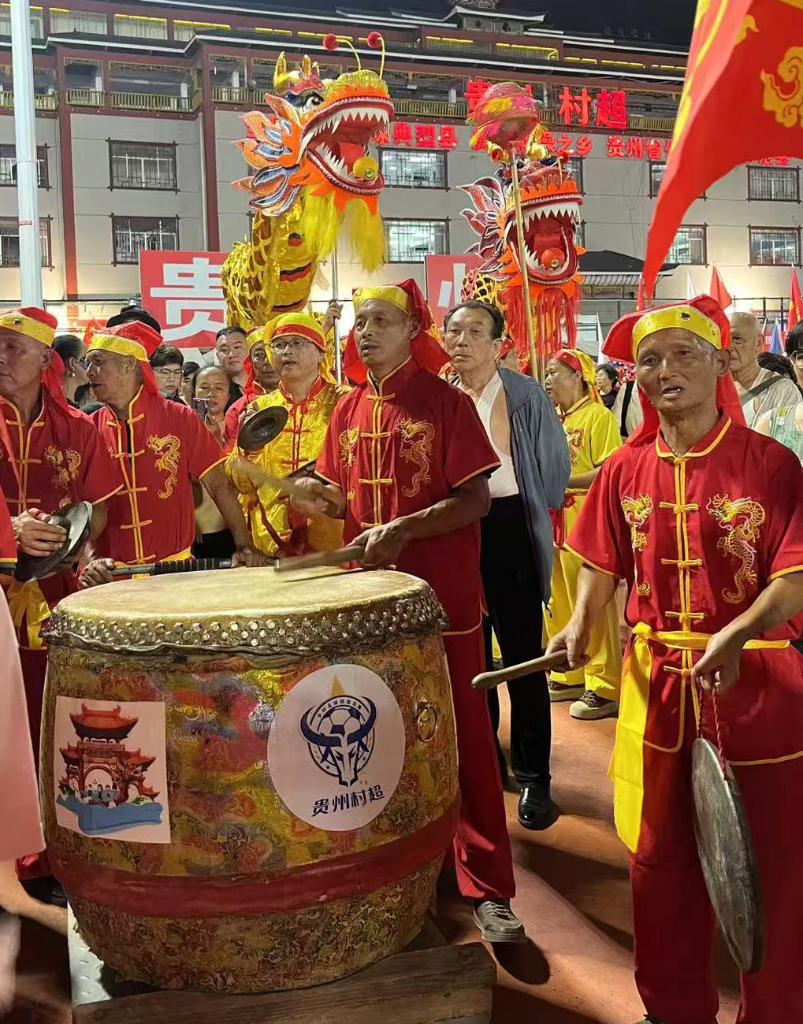 图为7月26日杨明刚敲着大鼓参加“村超”感恩重启大巡游。受访者供图