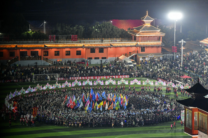 7月26日,人们在贵州“村超”球场表演节目(无人机照片)。新华社记者杨文斌摄