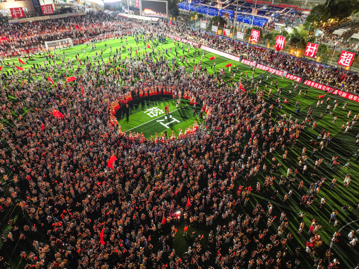 7月26日,人们涌向贵州“村超”球场一起跳民族舞蹈“多耶”(无人机照片)。新华社记者杨文斌摄