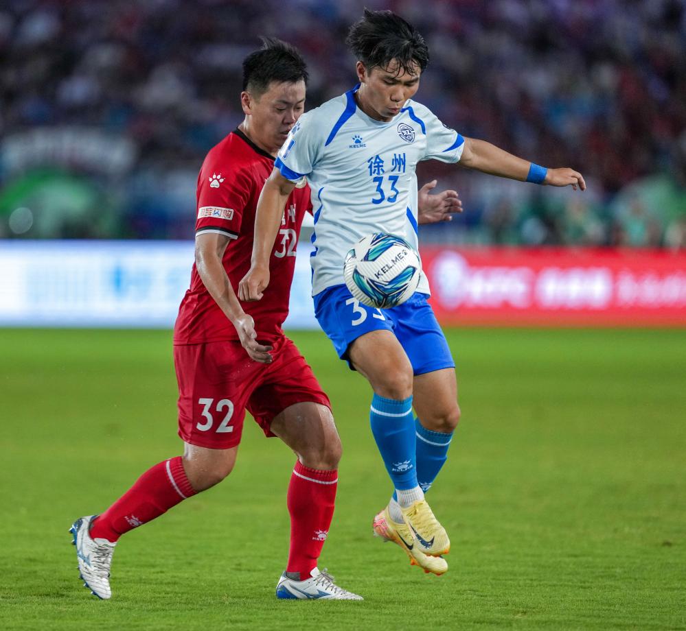 2025年7月20日,徐州队球员王凯旋(右)在第七轮比赛中拼抢。新华社记者 李博 摄