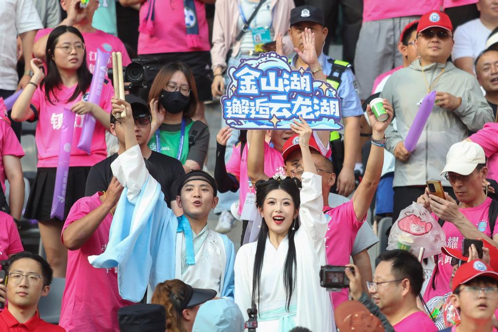 2025年6月15日,镇江球迷打扮成白素贞和许仙为球队助威。(冷知识:水漫金山的金山寺就在镇江) 新华社发(白雪 摄)