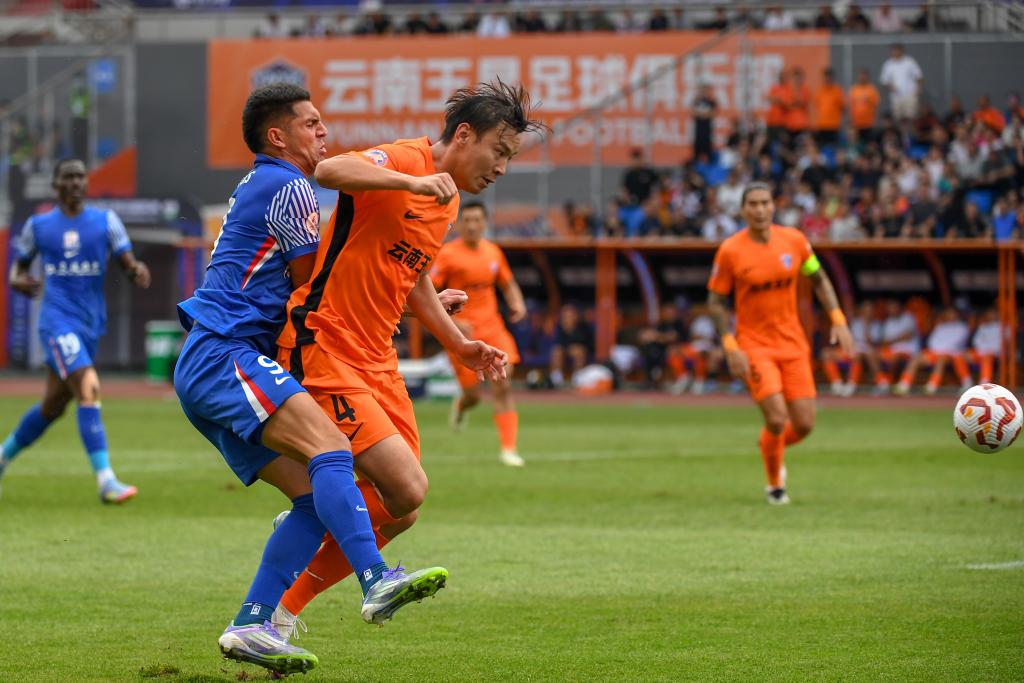 8月2日,云南玉昆队球员李松益(前)在比赛中和上海申花队球员安德烈·路易斯拼抢。新华社记者 彭奕凯 摄