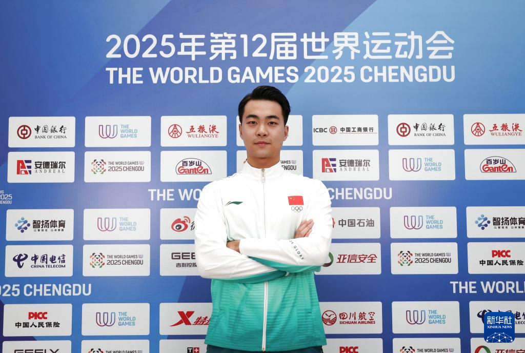 当日,成都世运会开幕式中国代表团旗手、技巧项目男子运动员史经纬在成都世运会主媒体中心接受集体采访。