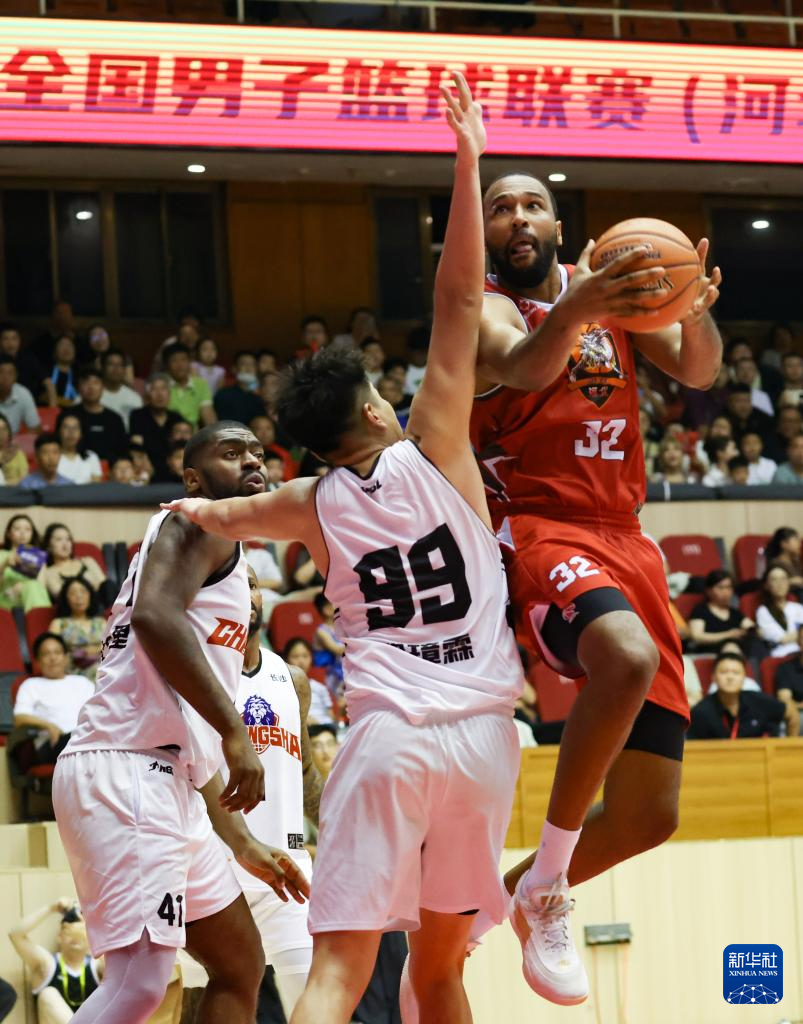 8月6日,石家庄翔蓝队球员汤普森(上右)在比赛中上篮。