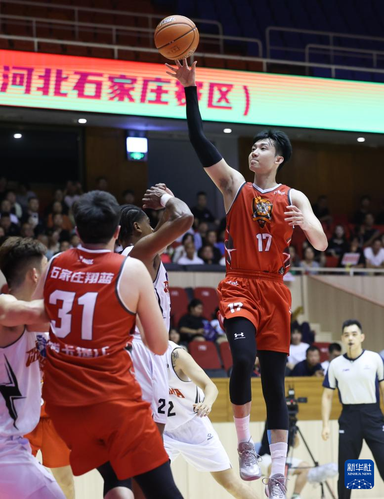 8月6日,石家庄翔蓝队球员王子麒(右上)在比赛中投篮。