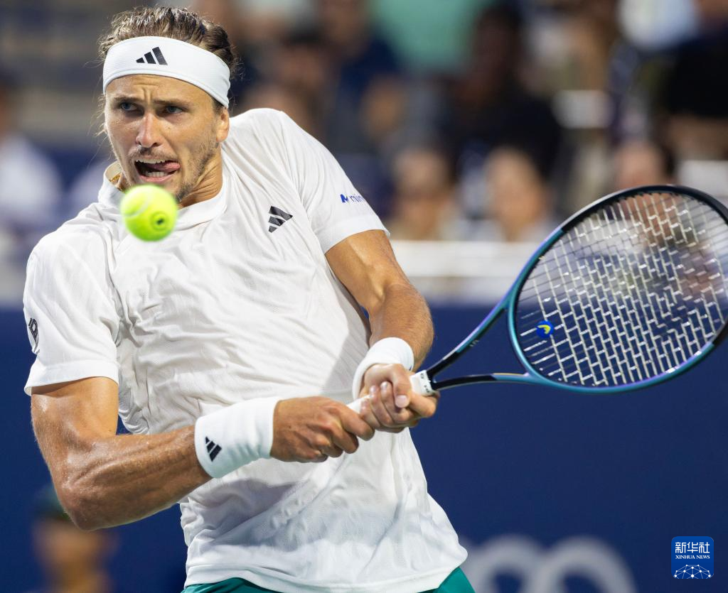 8月6日,德国选手兹维列夫在比赛中回球。