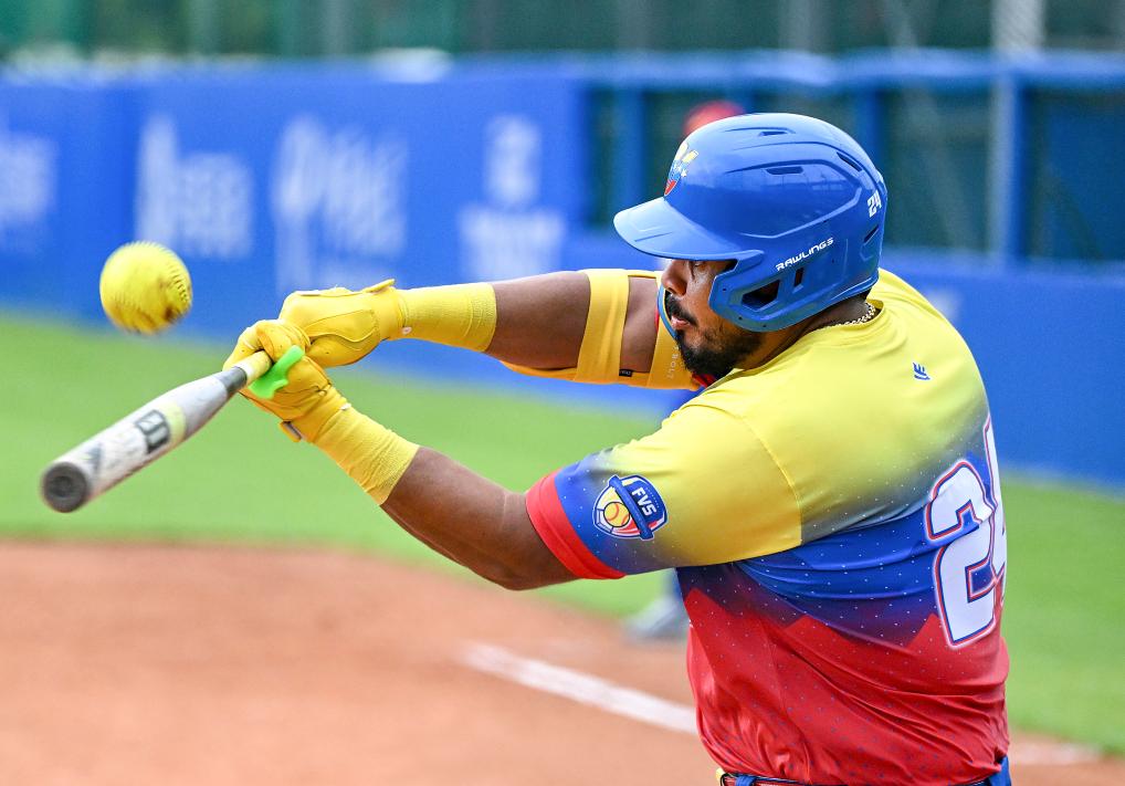 8月6日,委内瑞拉队球员迪亚斯在成都世运会垒球男子预赛A组比赛中击球。新华社记者 冯开华 摄