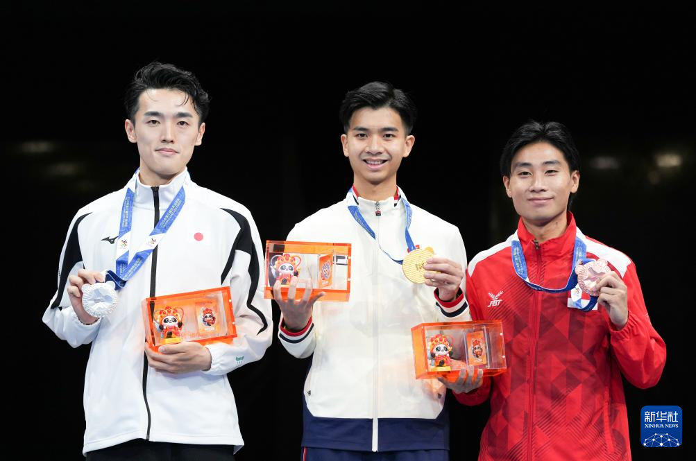 8月9日,亚军日本选手荒谷友硕、冠军中国香港选手杨颂熹、季军新加坡选手郑宇轩(从左至右)在颁奖仪式上。