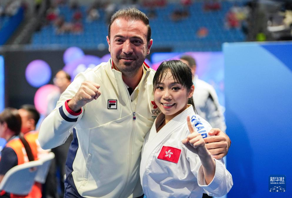 8月8日,中国香港选手刘慕裳(右)在决赛金牌赛后与教练庆祝。最终,她获得金牌。