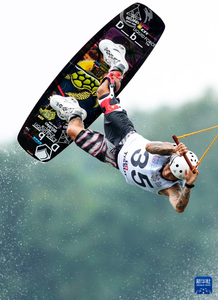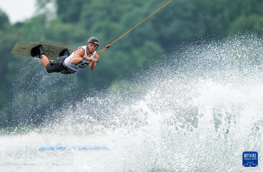 8月9日,中国选手张伟在男子索道滑水复活赛中。
