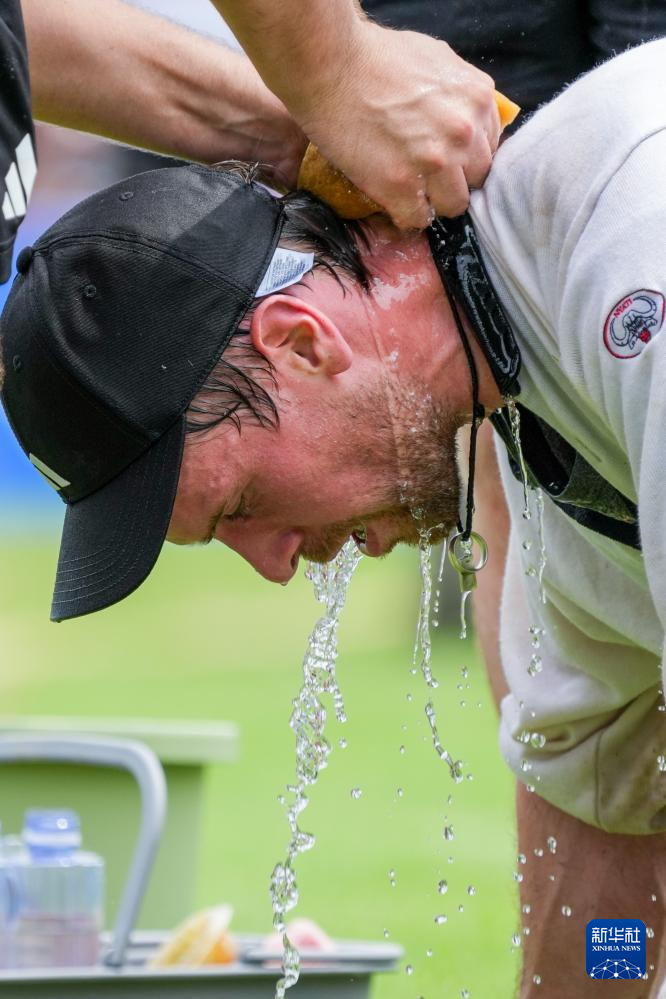 8月9日,德国队队员在比赛中洒水降温。