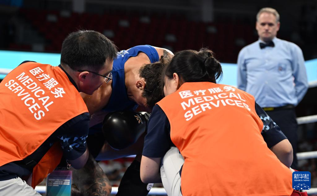 8月9日,乌克兰选手叶菲缅科(中)在比赛中接受治疗。