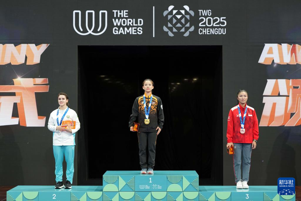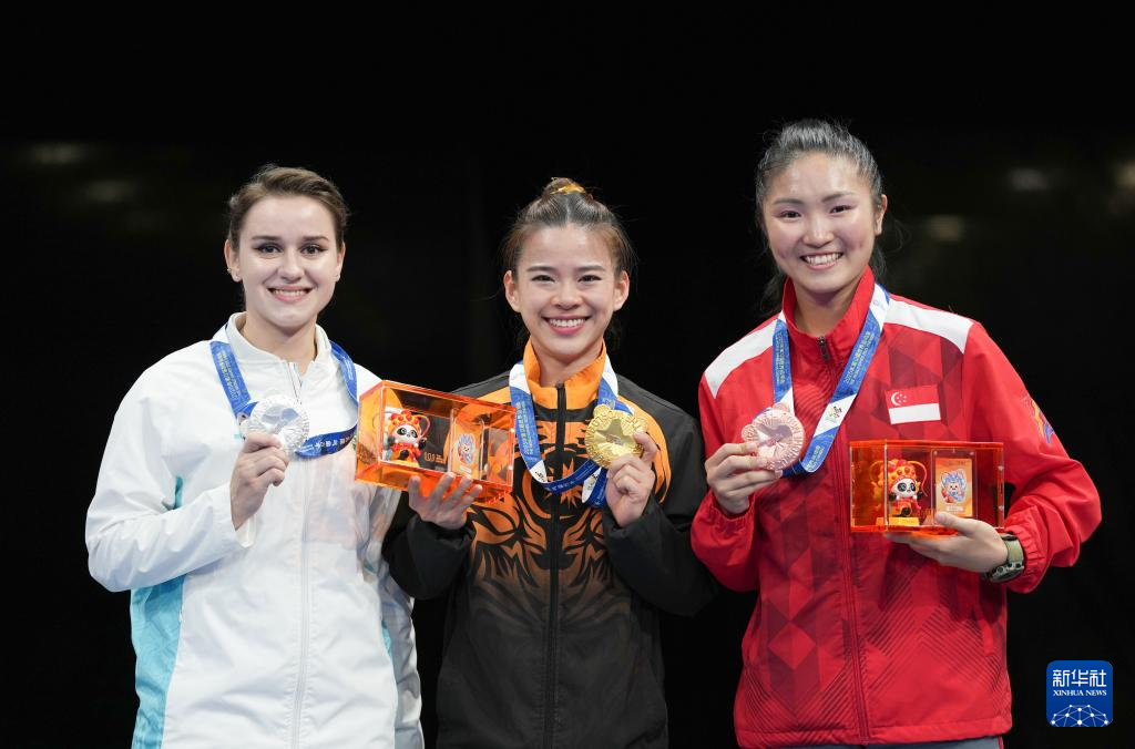 8月9日,亚军乌兹别克斯坦选手拉季舍娃、冠军马来西亚选手陈昌敏、季军新加坡选手卡桑德拉·王(从左至右)在颁奖仪式上。