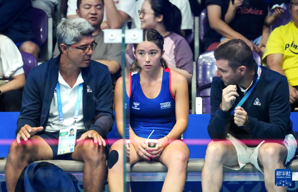 8月9日,法国选手卡拉(中)在比赛间隙接受教练指导。