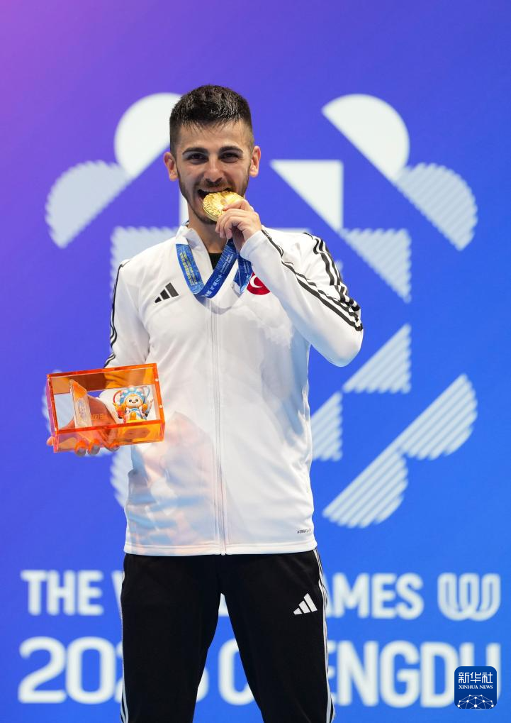 8月8日,冠军土耳其选手桑丹(中)、亚军日本选手桥本大梦(左)与季军希腊选手克塞诺斯在领奖台上。