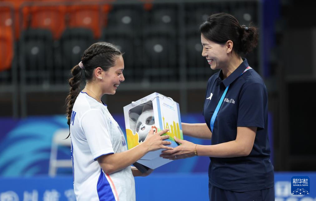 8月9日,成都新都香城体育中心工作人员为当天20岁生日的泰国队球员卡尔布姆(左)送上生日礼物。