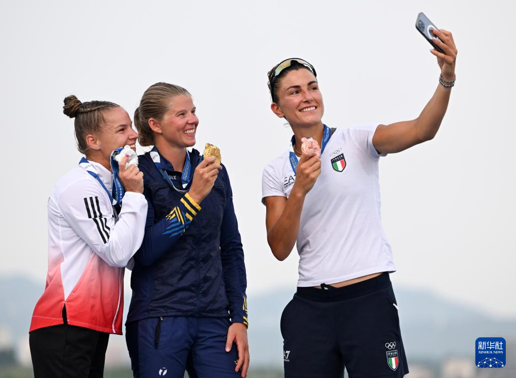 8月9日,冠军瑞典选手安德森(中)、亚军匈牙利选手万达(左)、季军意大利选手奇卡利在颁奖仪式上自拍。