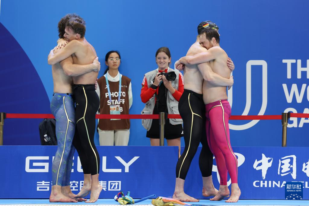 8月10日,德国队选手在比赛后相拥庆祝。最终,他们获得冠军并创造新的世界纪录和赛会纪录。