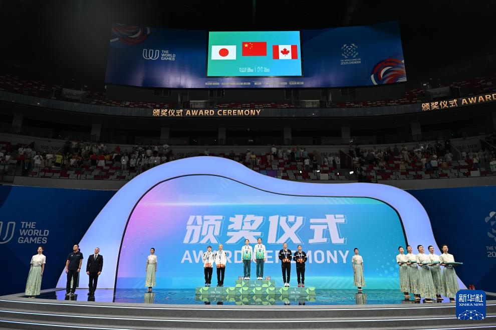 8月10日,冠军中国组合(中),亚军日本组合(左)和季军加拿大组合在颁奖仪式上。